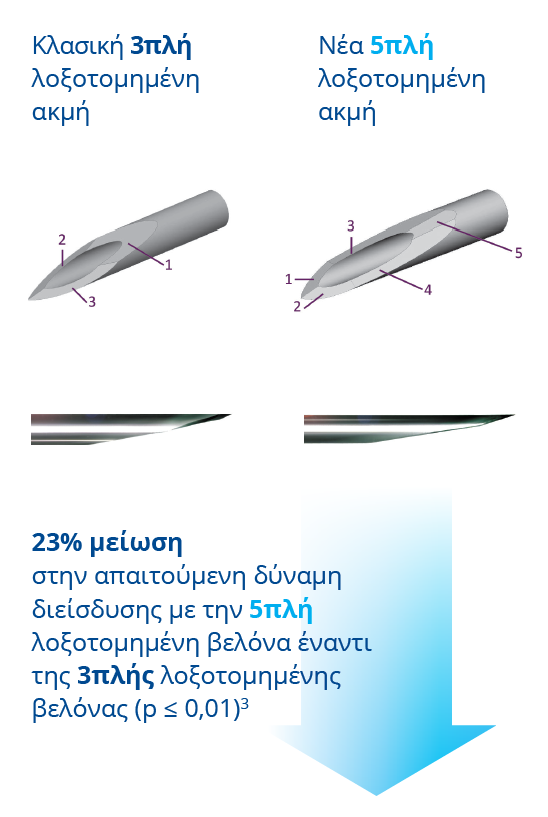 Η βελτιωμένη γεωμετρική κατασκευή του άκρου της βελόνας έχει άμεση επίδραση στη δύναμη που απαιτείται για τη διείσδυση στο σώμα³